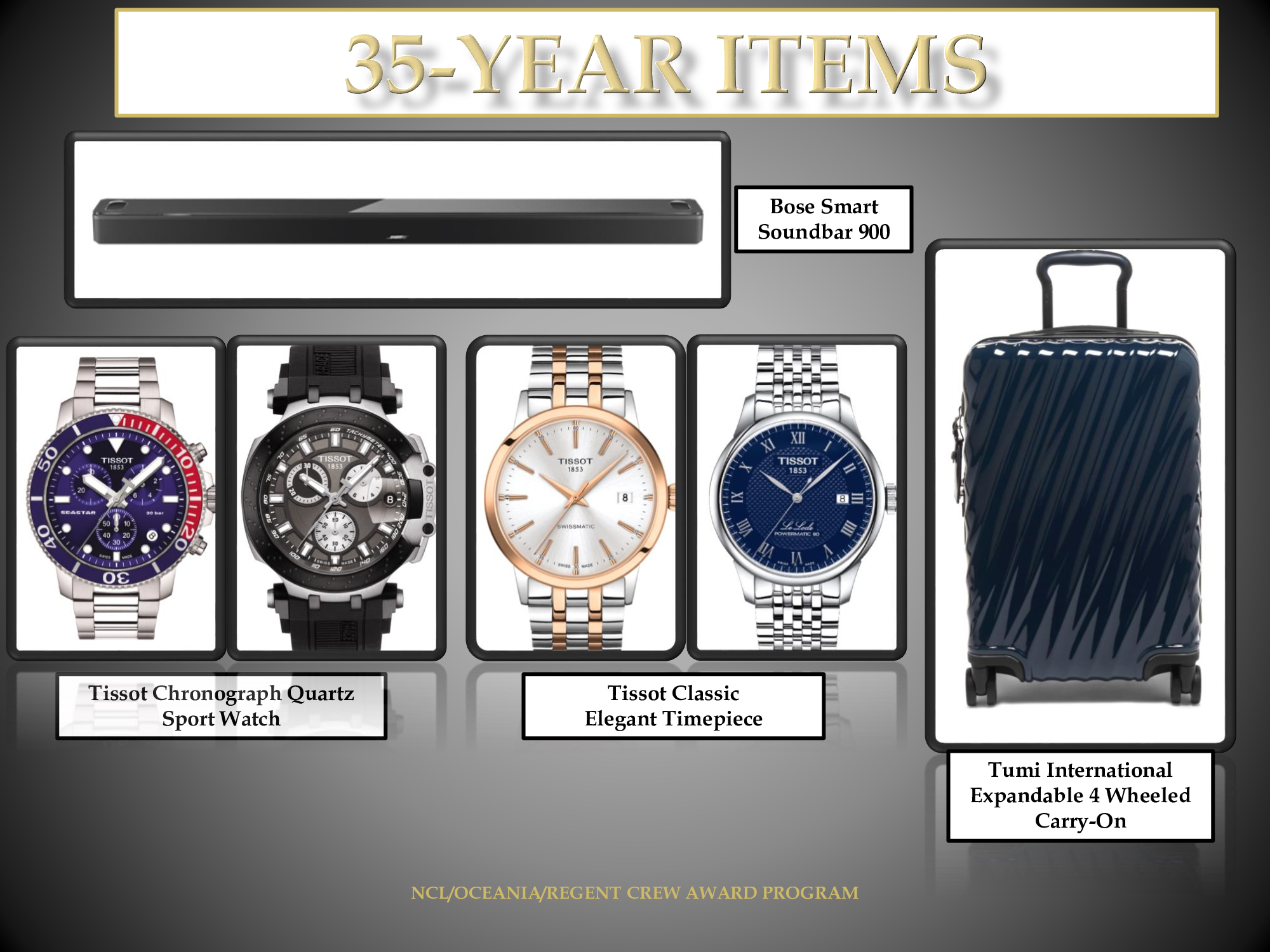 "*" indicates required fields NameThis field is for validation purposes and should be left unchanged.Date* MM slash DD slash YYYY Crew Member Number*Crew Member Name* First Last Crew Member Position*Crew Member Seniority* MM slash DD slash YYYY End Date (Current Contract)* MM slash DD slash YYYY Select Cruise Line*Select an optionNorwegianOceaniaRegentSelect Norwegian Ship*Select an optionNorwegian AquaNorwegian BlissNorwegian BreakawayNorwegian DawnNorwegian EncoreNorwegian EpicNorwegian EscapeNorwegian GetawayNorwegian JadeNorwegian JewelNorwegian JoyNorwegian GemNorwegian PearlNorwegian Pride of AmericaNorwegian PrimaNorwegian SkyNorwegian SpiritNorwegian StarNorwegian SunNorwegian VivaSelect Oceania Ship*Select an optionOceania M/S InsigniaOceania M/S MarinaOceania M/S NauticaOceania M/S RegattaOceania M/S RivieraOceania M/S SirenaSelect Regent Ship*Select an optionRegent Seven Seas SS ExplorerRegent Seven Seas SS MarinerRegent Seven Seas SS VoyagerRegent Seven Seas SS NavigatorLapel Pins*Select an optionYear of Award - 15 YearYear of Award - 20 YearYear of Award - 25 YearYear of Award - 30 Year35 Year – NO PIN PLEASE CHOOSE GIFT BELOW40 Year – NO PIN PLEASE CHOOSE GIFT BELOW45 Year – NO PIN PLEASE CHOOSE GIFT BELOW*There are additional gifts on the selection of 15 Years & above, choose from the drop down menu below.Gift Award on 15 Year*Select an option1/20 Gold Necklace w/ PendantNautica Watch Blue Face & Blue Silicone StrapTumi Foldable BackpackTourneau Watch White Face & Black Strap - MensTourneau Watch Silver Face & Black Strap - LadiesGift Award on 20 Year*Select an optionBose Soundlink Flex Bluetooth SpeakerTumi Pocket Small BagTourneau Silver Face w/ Black Strap WatchGift Award on 25 Year*Select an optionBang & Olufsen Beosound Explore Bluetooth SpeakerTourneau Watch Black Face w Stainless BandTourneau Watch Silver Face w/ Stainless BandTumi Crossbody BagGift Award on 30 Year*Select an optionMovado BoldBose noise cancelling headphones 700Tumi BackpackGift Award on 35 Year*Select an optionBose Smart Soundbar 900Tissot Chronograph Quartz Sport Watch - BlackTissot Chronograph Quartz Sport Watch - SilverTissot Classic Elegant Timepiece - BlueTissot Classic Elegant Timepiece - GoldTumi International Expandable 4 Wheeled Carry-OnGift Award on 40 Year*Select an optionCartier Tank SoloGift Award on 45 Year*Select an optionOMEGA SEAMASTER DIVER 300MAward selection may change at any time without prior notice due to inventory shortages beyond our controlComment or Special InstructionCAPTCHA 5 Year Pin 10 Year Pin 15 Year Pin 20 Year Pin 25 Year Pin 30 Year Pin